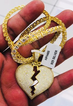 925 Sterling Silver Gold 5x Finish Broken Heart Pendant Tennis Chain $110Anaheim, CA