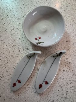 Japanese Shigaraki Ware Hechimon small ceramic bowl with 2 matching utensil rests $10Santa Monica, CA