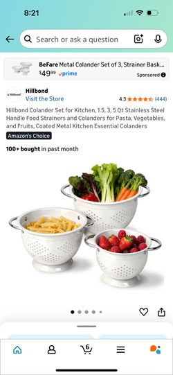 Hillbond Colander Set for Kitchen, 1.5, 3, 5 Qt Stainless Steel Handle Food Strainers and Colanders for Pasta, Vegetables, and Fruits, Coated Metal Ki$10Philadelphia, PA