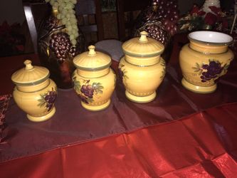Kitchen canisters and two grape holder decorations in back$50San Antonio, TX