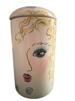 8”ceramic canister featuring a distinctive hand-painted design of a woman's face, created by artist Cheryl Thompson. It is part of her "Atmospheres" c$22Orange, CA