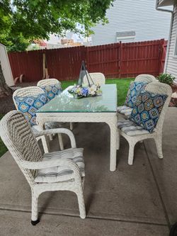 Wicker Patio Set, Table, Glass Topper, 6 Chairs, Cushions, Pillows, & Chandelier $225Bellevue, NE