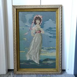 Large Vintage "Pinkie" Framed Needlepoint Embroidery Portrait 1970s $60Pt Charlotte, FL