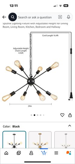 SineRise Plug-in Sputnik Chandeliers Black, 8 Lights Modern Sputnik Lighting Fixture with Adjustable Height for Dining Room, Living Room, Kitchen, Bed$25Hemet, CA