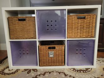 White cabinet bookshelf with storage container cubes$70San Marcos, CA