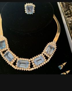 14 karat yellow gold diamond and blue topaz ring, earings and necklace.$7,500San Diego, CA