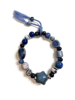 Blue Star Bracelet Tan Speckled Ceramic Beads Tassels Stretchy$10Kingston, GA