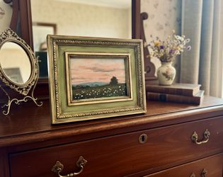 Landscape with Birds Flying Painting Hand painted in pale tones to give this piece a vintage vibe. Frame fit is 5x7 with the frame itself being metal$30Dekalb, IL