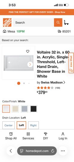 swiss madisson 60x32 acrylic white single, left hand drain shower base.$60Gilbert, AZ