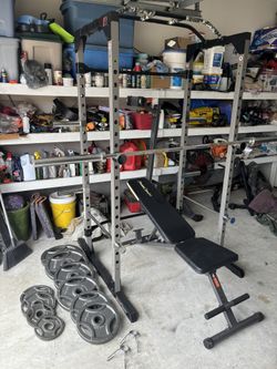 Olympic Squat Rack Cage/Pull ups/Storage Weight Pegs/Bench/240 LBS Olympic Plates/45 LB Bar $600Hope Mills, NC