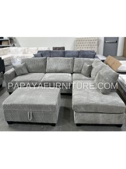 New! 106” Plush Gray Sectional, Sectional And Storage Ottoman, Sectionals, Sofa, Couch, Gray Couch, Sofas, Corduroy Sectional, USB Charger Sofa$479Fullerton, CA