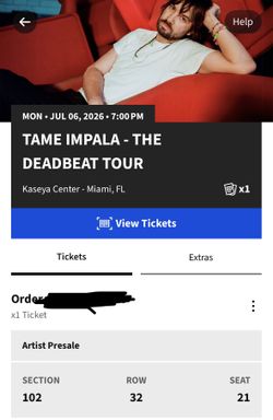 TAME IMPALA - THE DEADBEAT TOUR TICKET$250Quail Heights, FL
