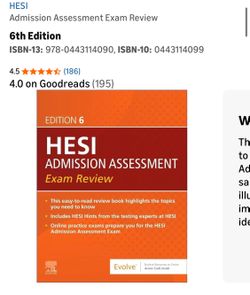 HESI Admission Assessment Exam Review 6th Edition ISBN-13: (contact info removed)114090, ISBN-10: 0(contact info removed)99$20Coachella, CA