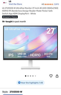 LG 27US500-W Ultrafine Monitor 27-Inch 4K UHD (3840x2160) HDR10 IPS Borderless Design Reader Mode Flicker Safe Switch App HDMI DisplayPort - White$160Miami, FL