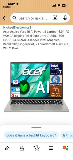 Acer Aspire Vero 16 AI Powered Laptop 16.0" IPS WQXGA Display (Intel Core Ultra 7 155U, 16GB LPDDR5X, 512GB PCIe SSD, Intel Graphics Backlit KB Finger$400Stafford, TX