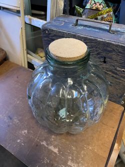 Vintage Large Glass Apothecary Jar Pumpkin Melon Green Tint Cork Lid Spain$40Austin, TX