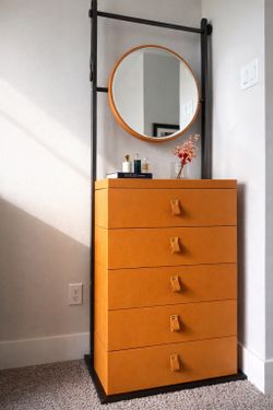 Designer Modern Full-Leather Wrapped Orange Dresser with Mirror – 5 Drawers$170Katy, TX
