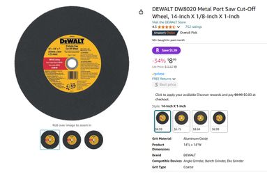 DEWALT DW8020 Metal Port Saw Cut-Off Wheel, 14-Inch X 1/8-Inch X 1-Inch$20Rancho Cucamonga, CA