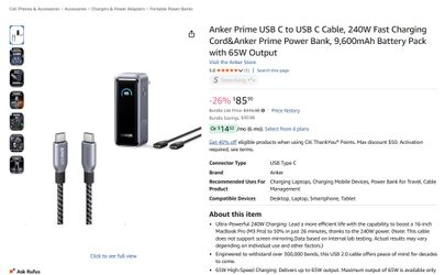 Anker Prime Power Bank, 9,600mAh Battery Pack with 65W Output$50Rancho Cucamonga, CA