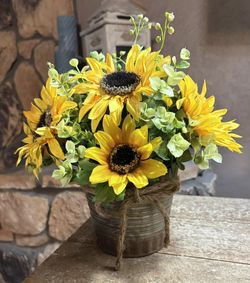Ht-11.5in Width-12in HANDMADE artificial Sunflowers / Eucalyptus In A Rustic Container $17Mesa, AZ