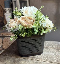 Ht-10in Width-13in HANDMADE artificial Cream/ Tan Floral In A Rustic Metal Container $18Mesa, AZ