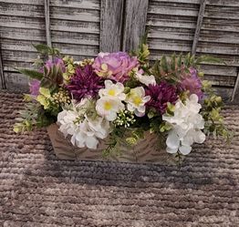 Ht-8in Width-17in HANDMADE artificial Purple Peonies /white Floral In A Wood Box With Ferns On Front $16Mesa, AZ