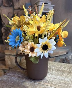 Ht-11.5in Width-12in HANDMADE artificial Floral In A Brown Ceramic Coffee Cup$12Mesa, AZ