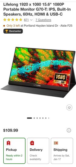 Lifelong 1920 x 1080 15.6" 1080P Portable Monitor G70-T: IPS, Built-In Speakers, 60Hz, HDMI & USB-C$85Vancouver, WA