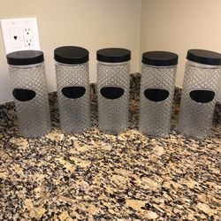 5 Glass Vases With Black Chock Labels And Black Lids $25Irvine, CA