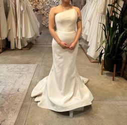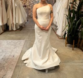 Romona Keveza Strapless gown made of silk crepe, features an asymmetrical neckline and a fluted skirt. $450Downey, CA
