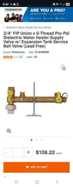 3/4" FIP Union x G-Thread Pro-Pal Dielectric Water Heater Supply Valve w/ Expansion Tank Service Ball Valve (Lead Free)$50Temecula, CA