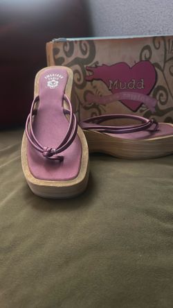 American Eagle purple metallic platform thong sandals with a wooden wedge sole.$15Oxnard, CA