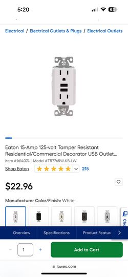 Eaton 15-Amp 125-volt Tamper Resistant Residential/Commercial Decorator USB Outlet...$10Glendale, AZ