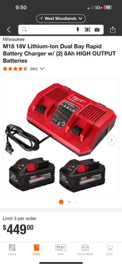 Milwaukee 2 M18 8.0ah Batteries NEW With Dual Charger$300Conroe, TX