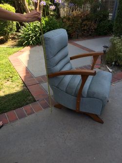 Vintage Retro Sky Light Blue Upholstered Rocker/Glider with dark finished oak legs and frame. Such a cool piece, just needs to be steam cleaned or re$85Laguna Niguel, CA