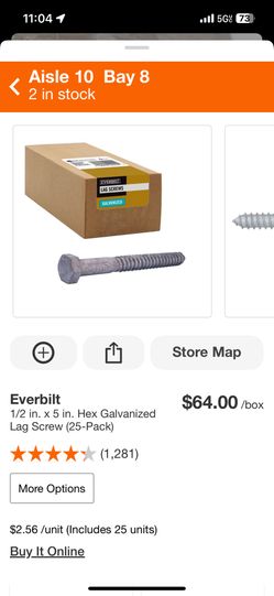 Everbilt 1/5 x 5 In Hex Galvanized Lag Screws (25pcs)$50Chicago, IL