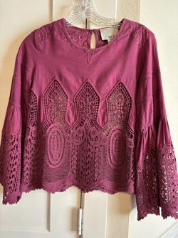 From Anthropologie—Chloe Oliver Fuscia Lace Cut Out Bell Sleeve Blouse Size XSP$5Katy, TX