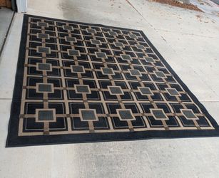 Durable rug with a modern geometric pattern. Has interconnected squares and lines in black, brown, and tan colors$100Santa Ana, CA