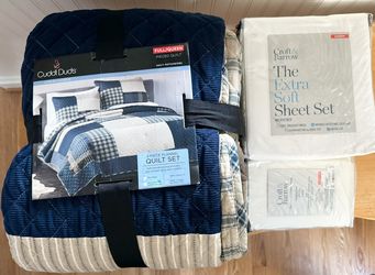 Cuddle Duds full/queen 3 piece flannel quilt set navy patchwork with sheets & Pillow cases $120Halethorpe, MD
