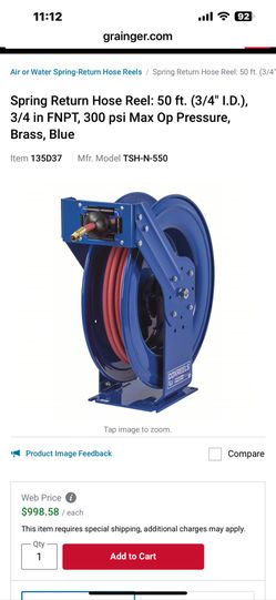 PRECIO ORIGINAL$1000 Spring Return Hose Reel: 50 ft. (3/4" I.D.), 3/4 in FNPT, 300 psi Max Op Pressure, Brass, Blue$200Phoenix, AZ