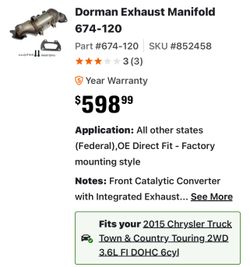 2011 a. 2019 Dogde Gran Caraban Y Chrysler Truck Town & Country 3.6l Catalityco Y Un Sensor De Oxígeno $250Phoenix, AZ