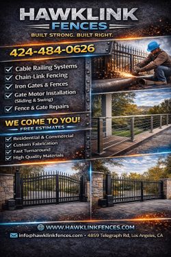 Hawklink Fences is a Los Angeles–based fencing and metal fabrication company dedicated to high-quality workmanship, clean design, and dependable service. We work with residential, commercial, and industrial clients throughout Southern California, delivering custom metal solutions built for strength, function, and long-term durability.