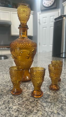 Vintage Amber Sandwich Glass Decanter Set With 4 Cordial Glasses$50Tulare, CA