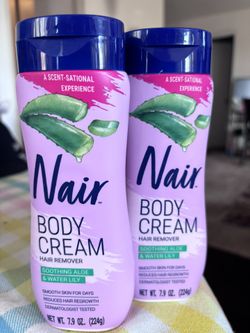 New Nair Body Cream Hair Remover. Soothing Aloe & Water Lily scent. Comes with 2 bottles, each 7.9 oz. Dermatologist tested, reduces hair regrowth for$5Downey, CA