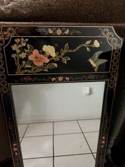 Vintage Asian Inspired Black Lacquered Wall Mirror 16x32 Asian Flowers And Blue Bird$50Chino, CA