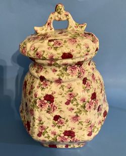 11 in high pink cabbage rose bud chintz jar w lid 8 in wide $40Chino, CA