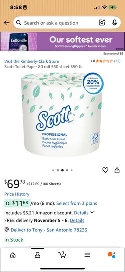 Scott Toilet Paper 80 roll 550 sheet 550 ft. $55San Antonio, TX