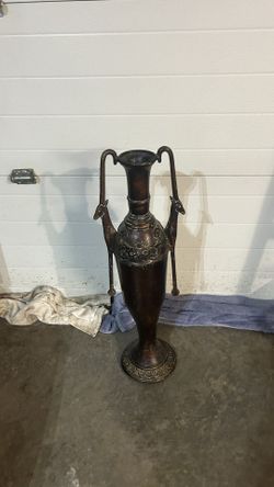Vintage bronze colored metal vessel vase 29”T with animal shaped handles and decorative patterns$15Sycamore, IL
