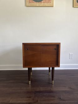 Mid-Century Modern Teak Record Cabinet / Nightstand – Sliding Doors, Brass-Tipped Legs$225Miami, FL