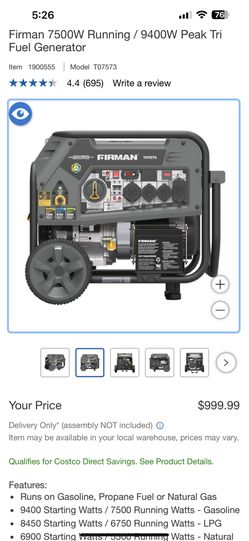 Firman 7500W Running / 9400W Peak Tri Fuel Generator$399Orangevale, CA